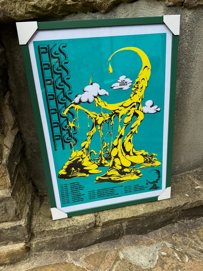 A rare chance to grab a piece from the sold-out 2023 Pigs Pigs Pigs Pigs Pigs Pigs tour, including their unforgettable night at The Trades Club. This original tour poster is beautifully presented in a bespoke green frame, making it a standout piece for any fan or collector.