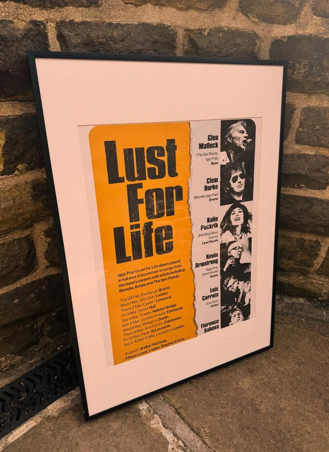 Own a piece of music history with this exclusive framed print from the Lust For Life 2023 tour, featuring legendary artists including Glen Matlock, Clem Burke, Katie Puckrik, Kevin Armstrong, Luis Correia, and Florence Saveva. A tribute to an unforgettable lineup, this print is professionally framed and ready to display.